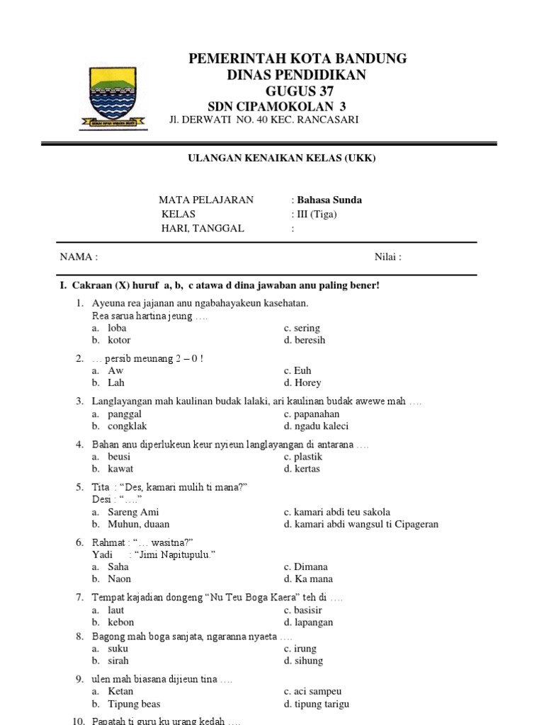 Soal ukk bahasa sunda kelas 1 sd semester 2.